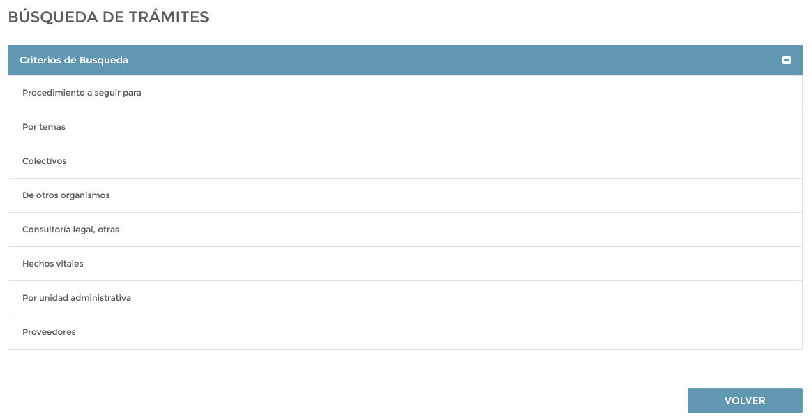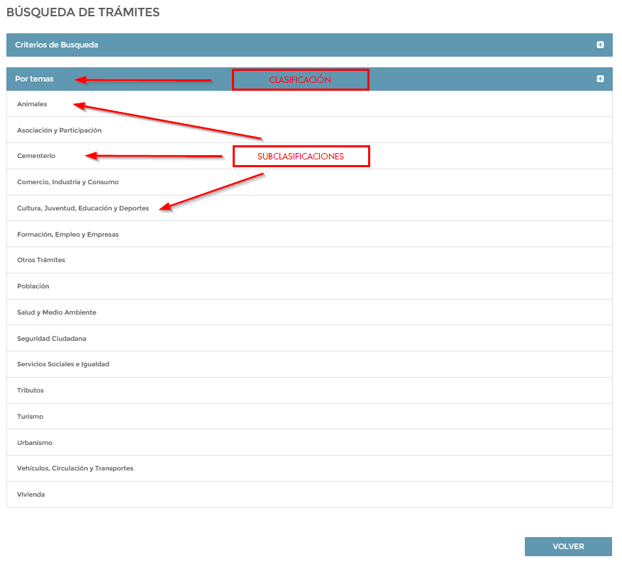 Como podemos observar disponemos de distintas clasificaciones donde podemos encontrar el trámite que estamos buscando.