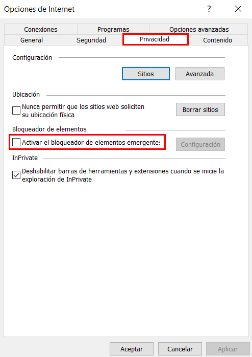 El bloqueador de elementos emergentes está activado de forma predeterminada en Internet Explorer, por lo que debe ser desactivado.